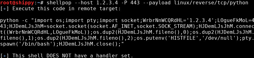 Generating a Python TCP reverse shell to IP 1.2.3.4 at port 443