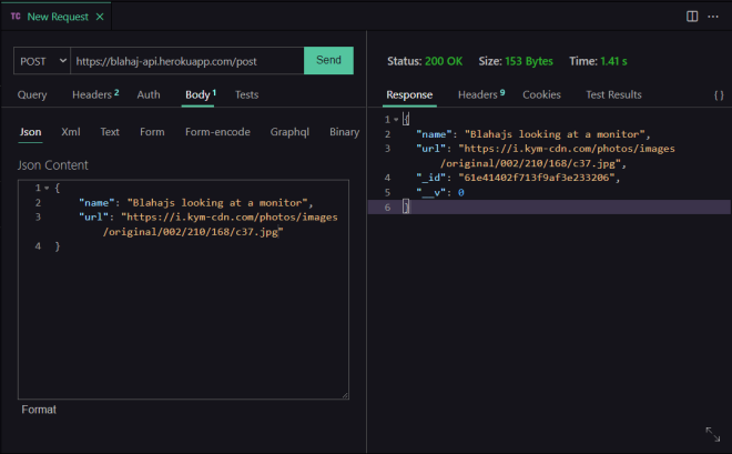 Blahaj API doesn't support posting via queries. To use the POST method you have to add body to the request. The body needs to have name and url path.