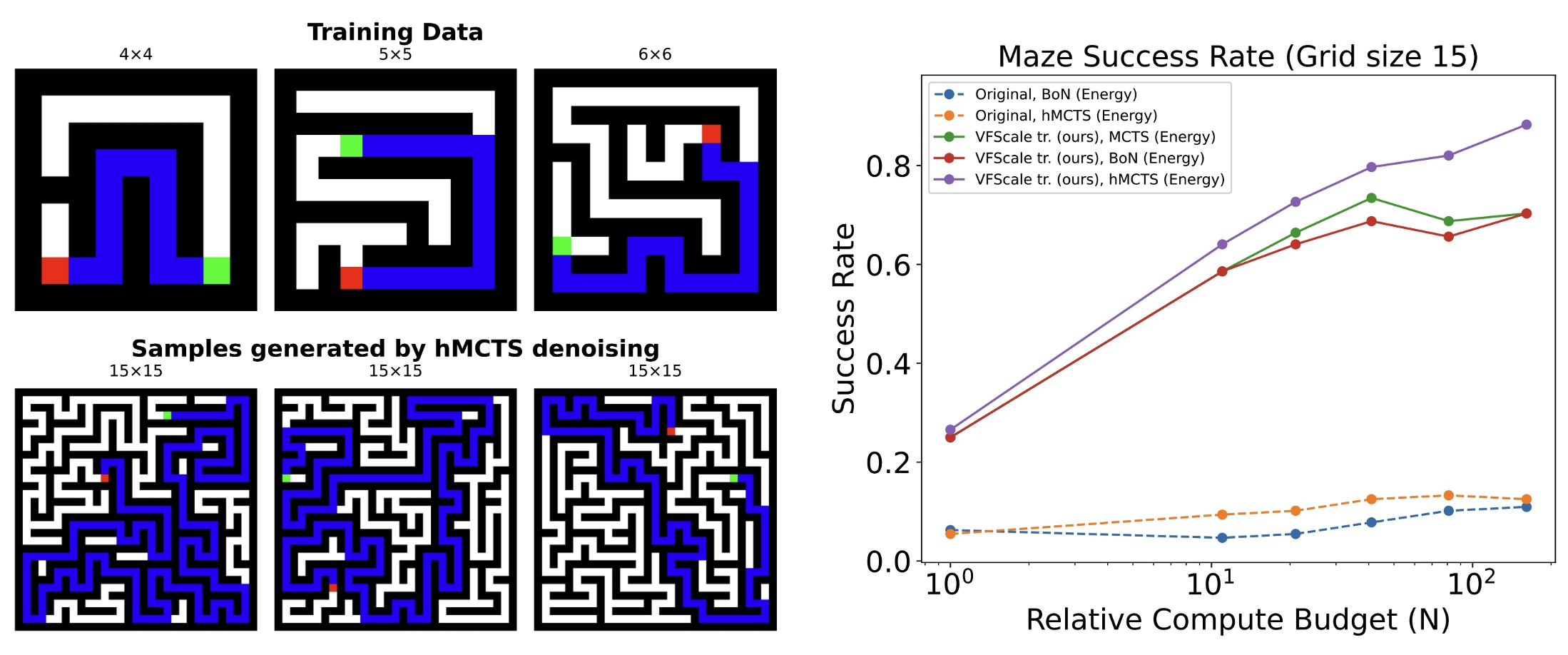 Trained with Maze tasks of up to 6x6, VFScale can generalize to solve much harder 15x15 Maze tasks, with larger test-time compute resulting in higher accuracy: