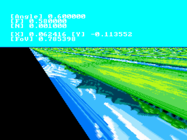 Player looking over a grassy plane that has a picture of a mountain on it.