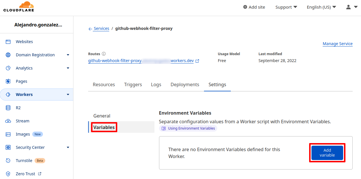 github-webhook-filter-proxy. Once there, go to the "Variables" section and add a new environment variable by clicking "Add variable".