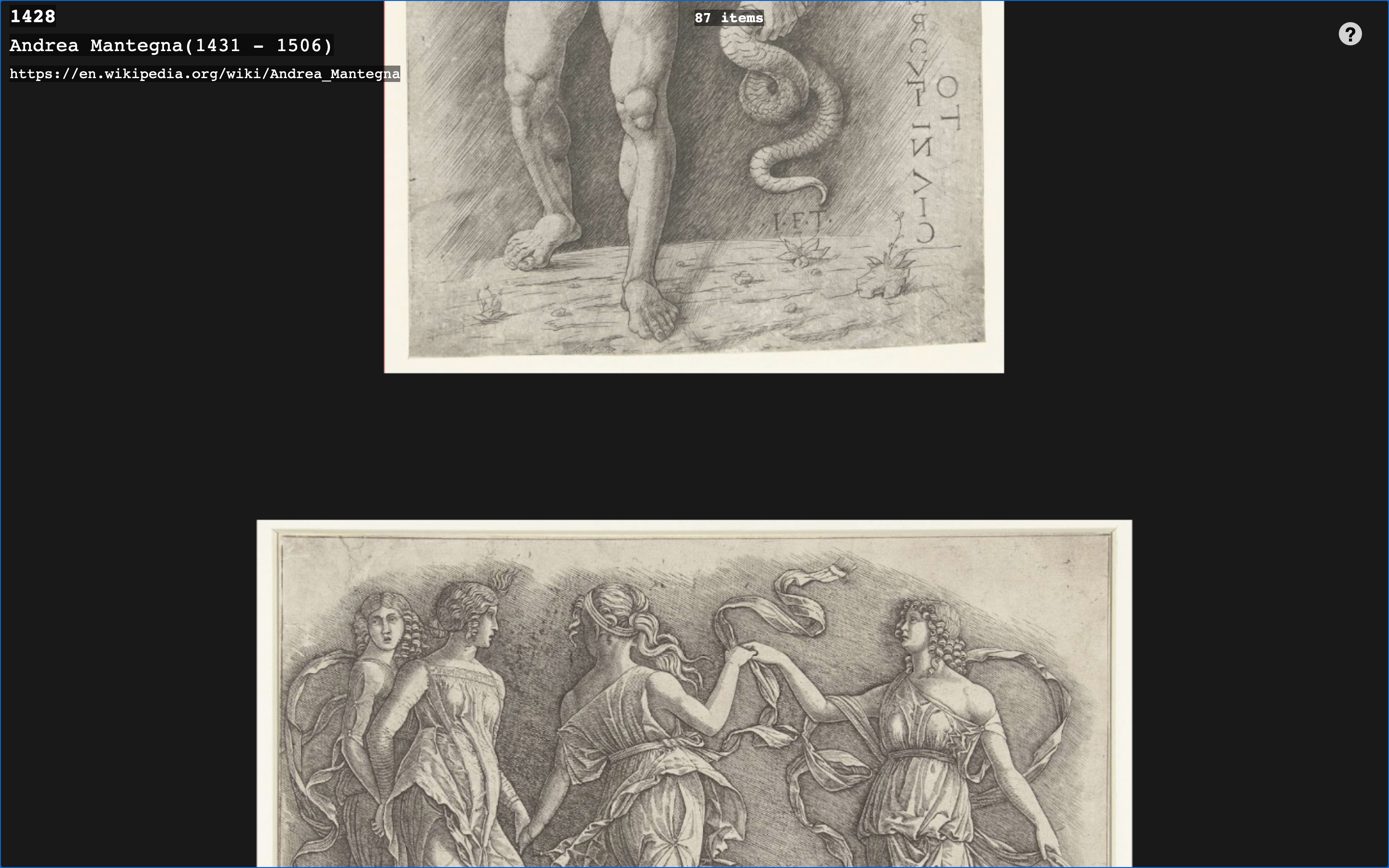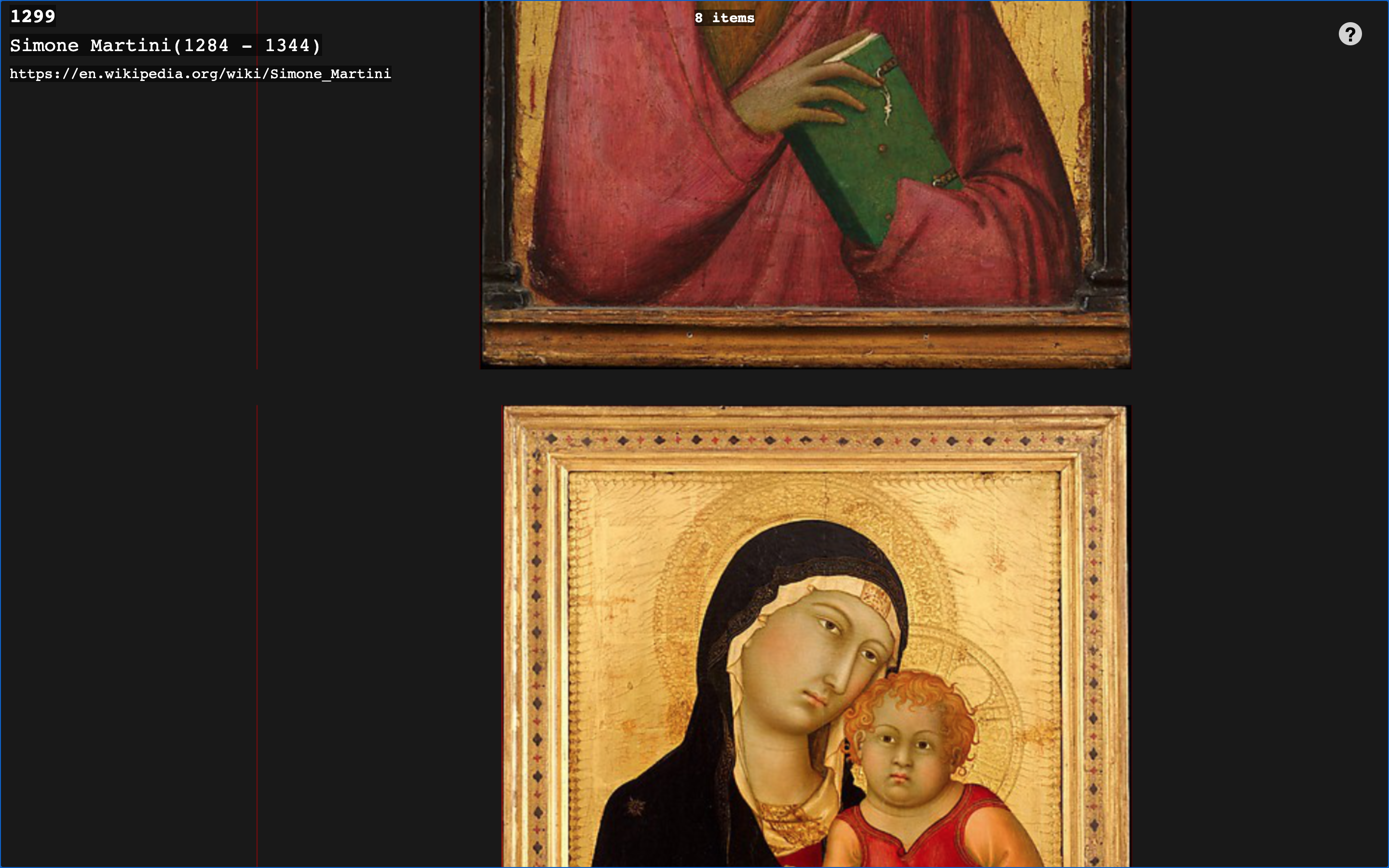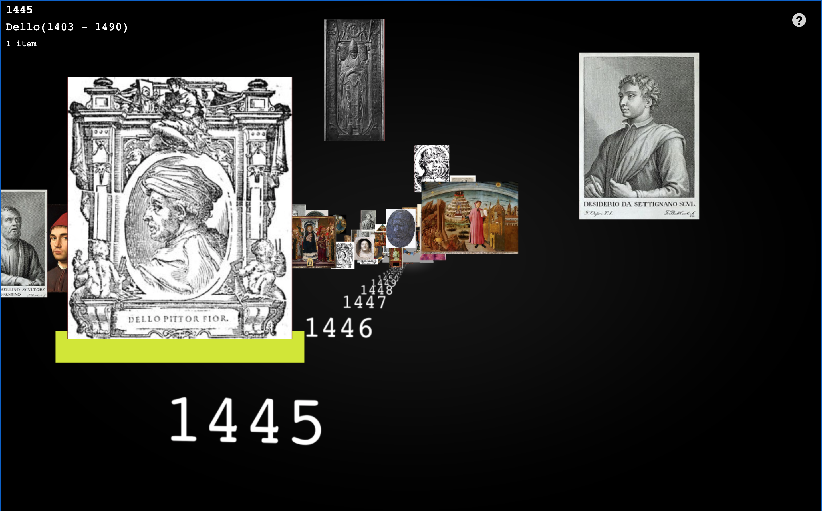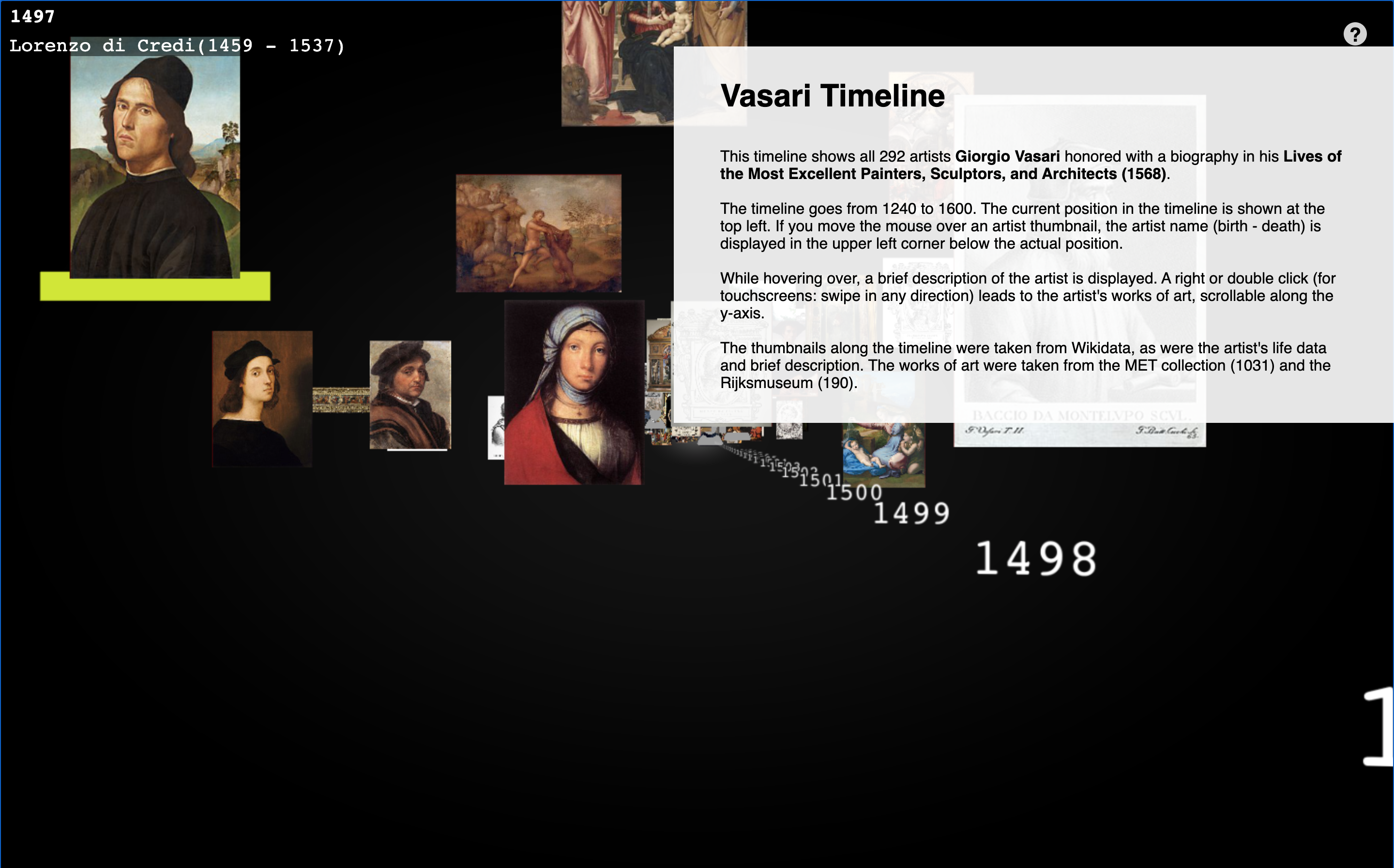 The visualization is still a prototype with errors such as double entries, and important features such as artwork metadata and touchscreen optimization are missing. Work in progress.