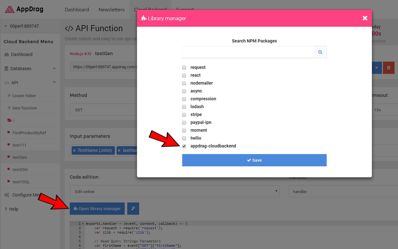 If your are inside a cloud function in CloudBackend, click on the "Open library manager" button then check the last checkbox named "appdrag-cloudbackend" then save.