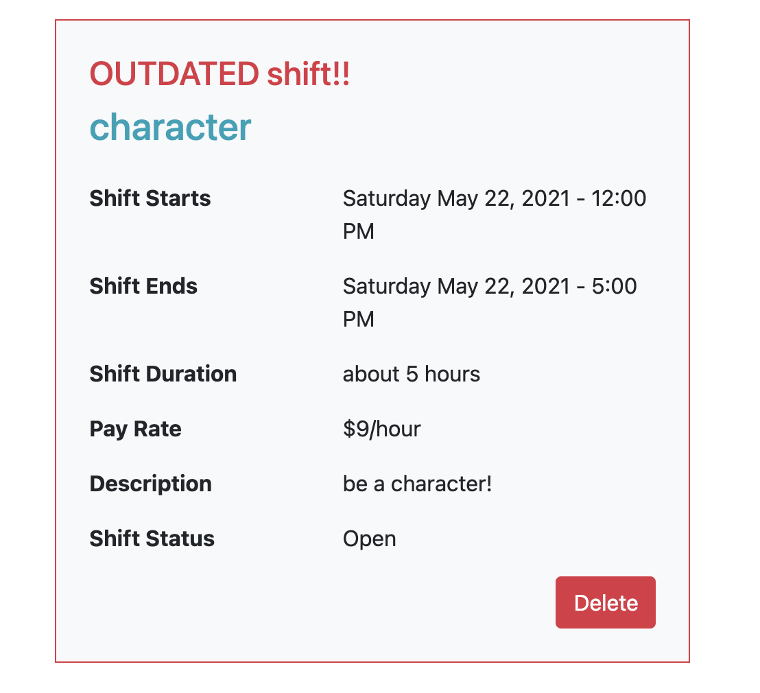 I created a shift in the (not-so-distant) future, only to get a message that the shift was outdated. It seems like shifts need to be created a certain amount of time before they happen, which should be communicated to users.