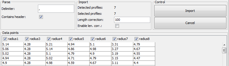 Here, the user can (de)select the column to be imported (checkbox in each column header). Furthermore, it is possible to automatically interpolate the data to a given number of equidistant x-coordinates (checkbox "Enable len. corr." and according number of data points in the field above). The y-value for the interpolated x-coordinates are derived via linear interpolation between the nearest enclosing original data points.