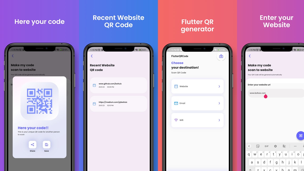A Flutter-based mobile application that allows users to generate QR codes from website URLs, view QR code history, and share or download them. Features a sleek bottom navigation and a visually appealing background color.