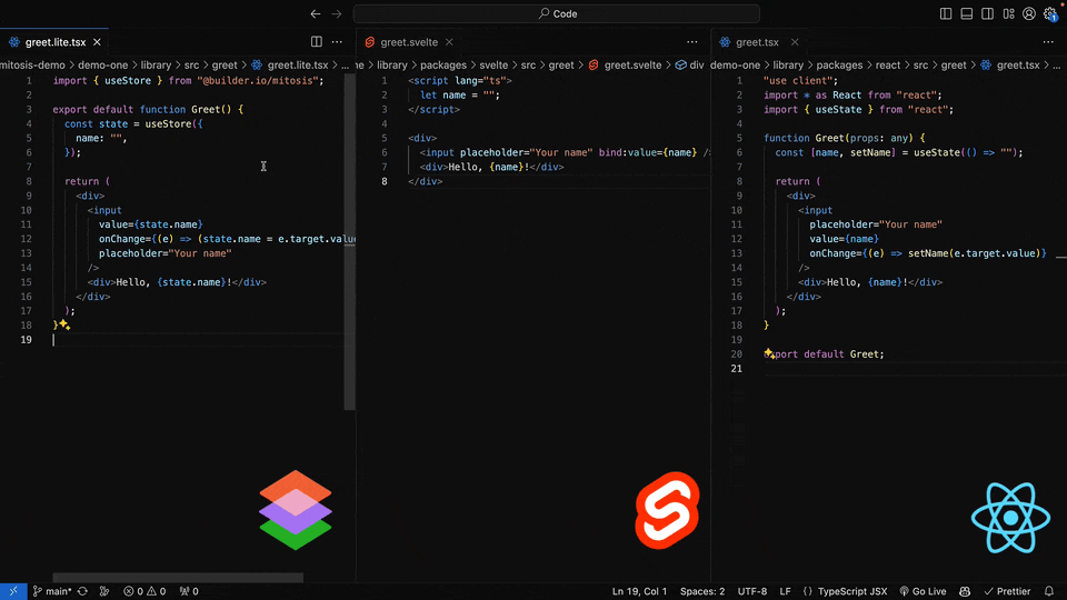 Mitosis provides a unified development experience across all frameworks, enabling you to build components in a single codebase and compile them to React, Vue, Angular, Svelte, Solid, Alpine, Qwik, and more.