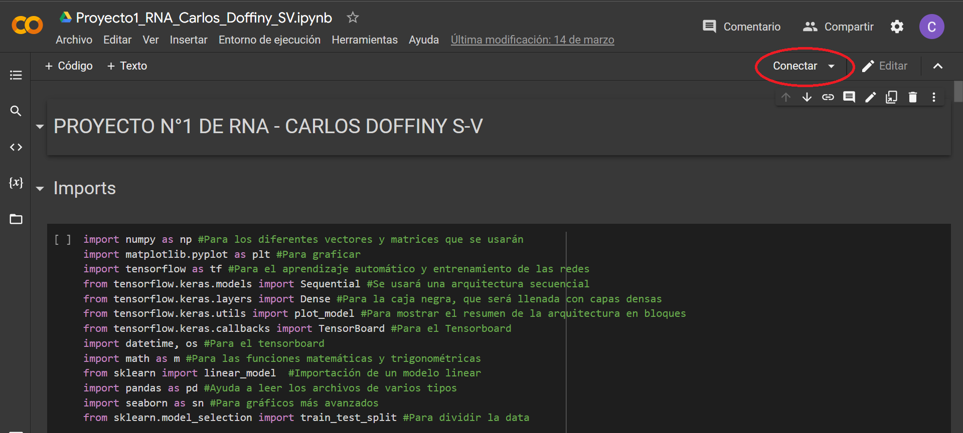 Proyecto1_RNA_Carlos_Doffiny_SV.ipynb - Una vez que se haya cargado el código, deberemos hacer click arriba a la derecha en donde dice Conectar para que así poder utilizar los recursos gratuitos en la nube que ofrece Google Colab.
