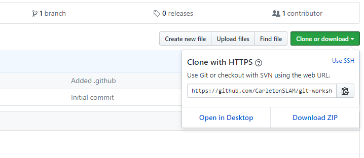 - Click on the "Clone or download" button and copy the HTTPS URL in the text box.