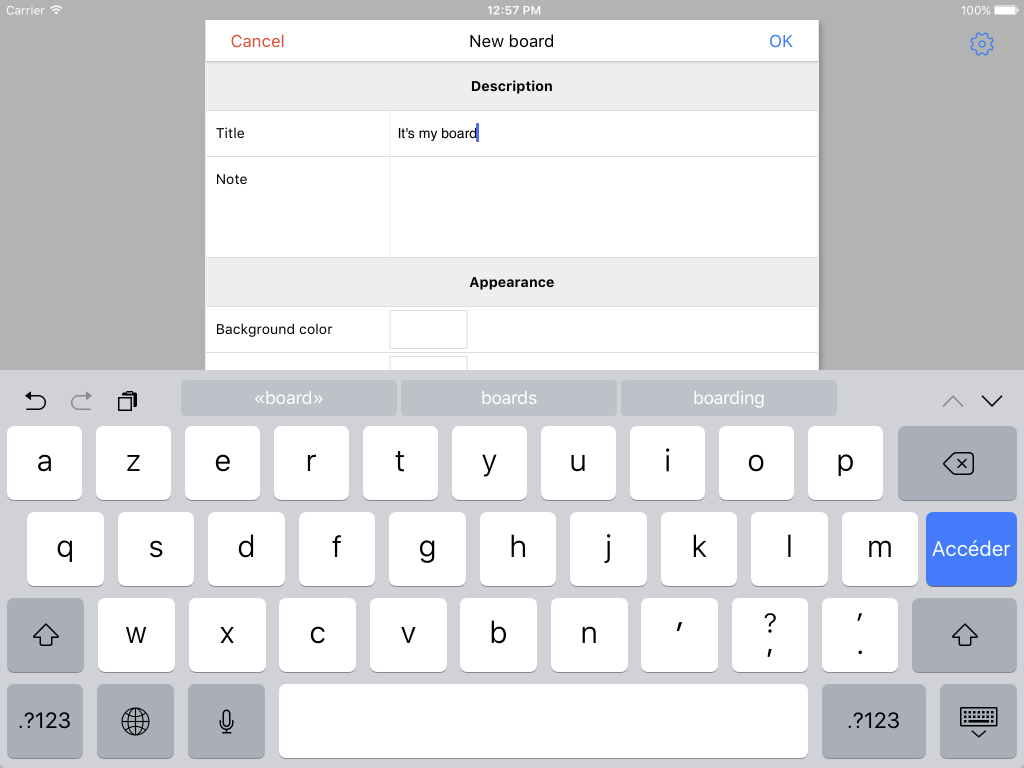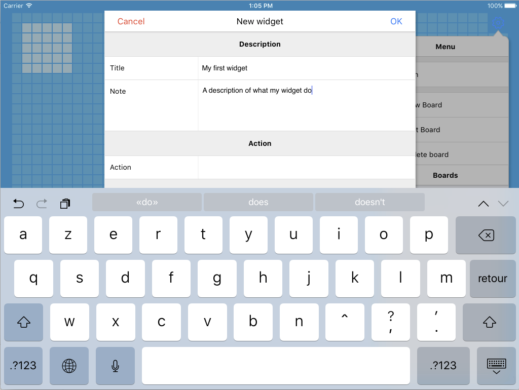 When in "edit" mode, the current board show a grid. Slide on the grid to initiate a widget.
