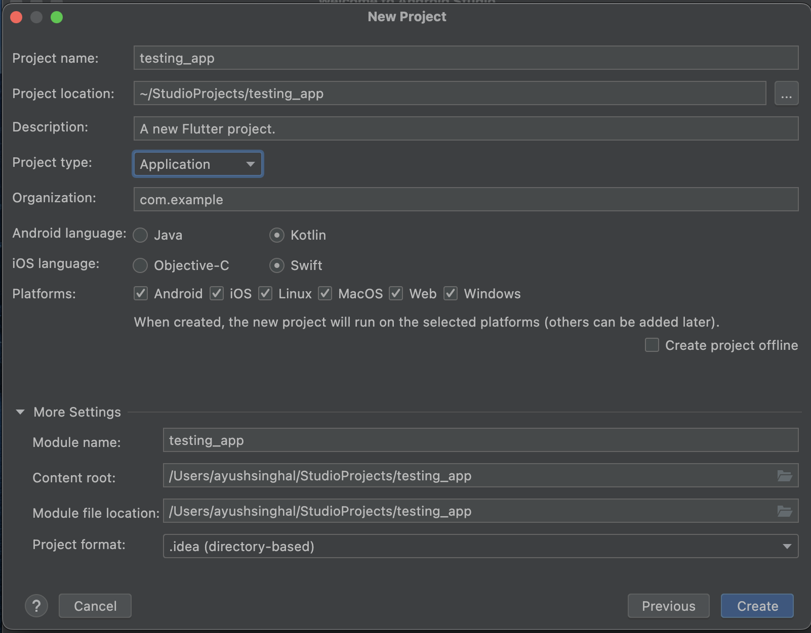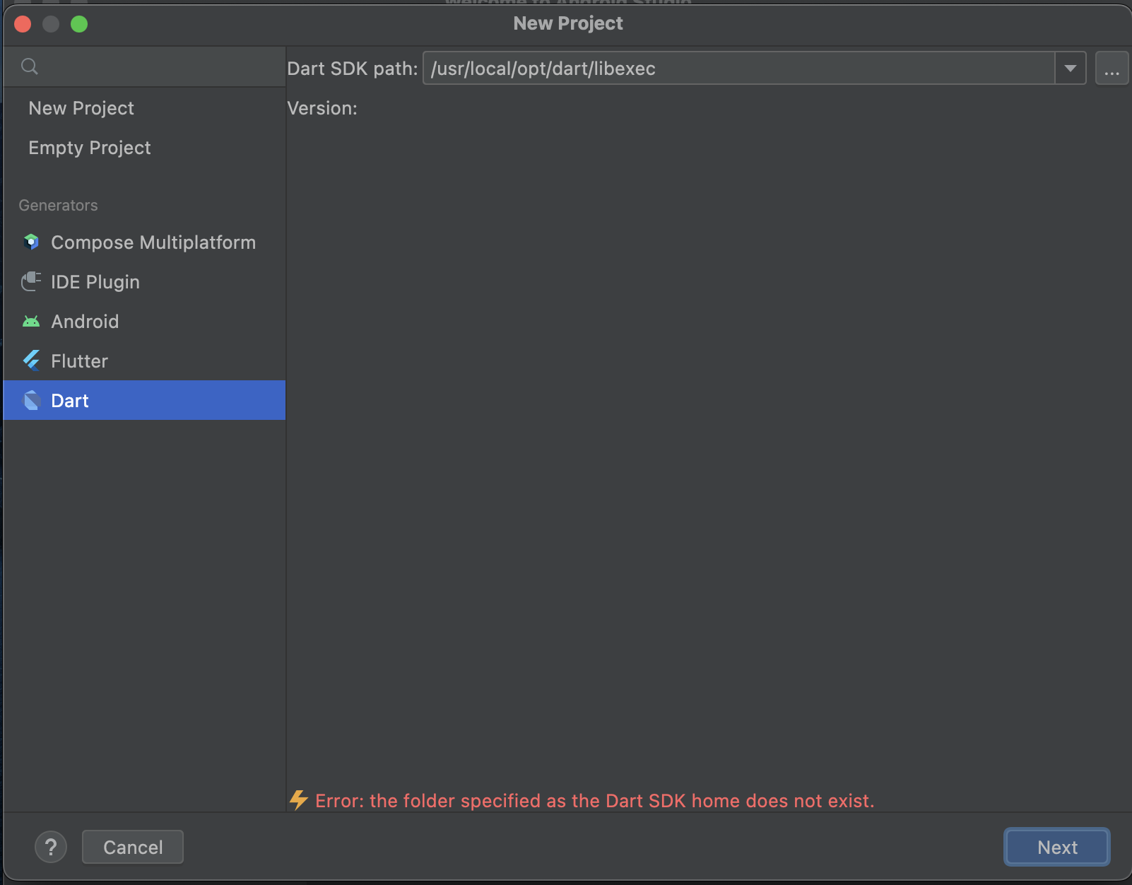There's no option to choose dart as a language. 2. Also what to choose in the other sections. 3. Under generator also when I click on dart, and click next then it shows an error that the folder specified as the dart sdk home does not exists.And again there is no radio button to select dart as a programming languages under both the fields android language and iOS language.