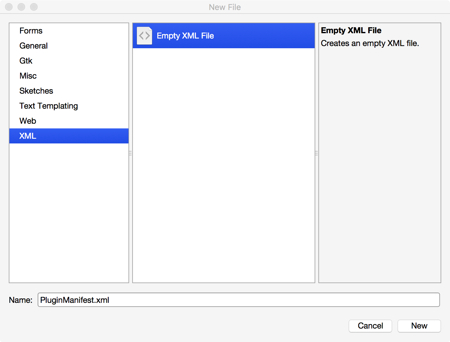 On the left now choose 'XML' and name your file 'PluginManifest.xml'. Hit 'New' to finish.