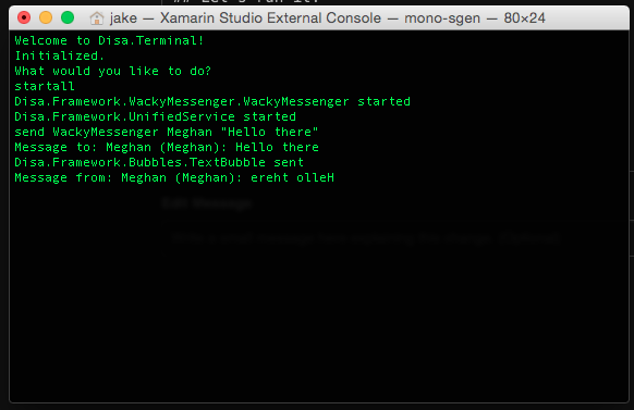 using Disa.Framework.WackyMessenger;Now, launch Disa.Terminal.