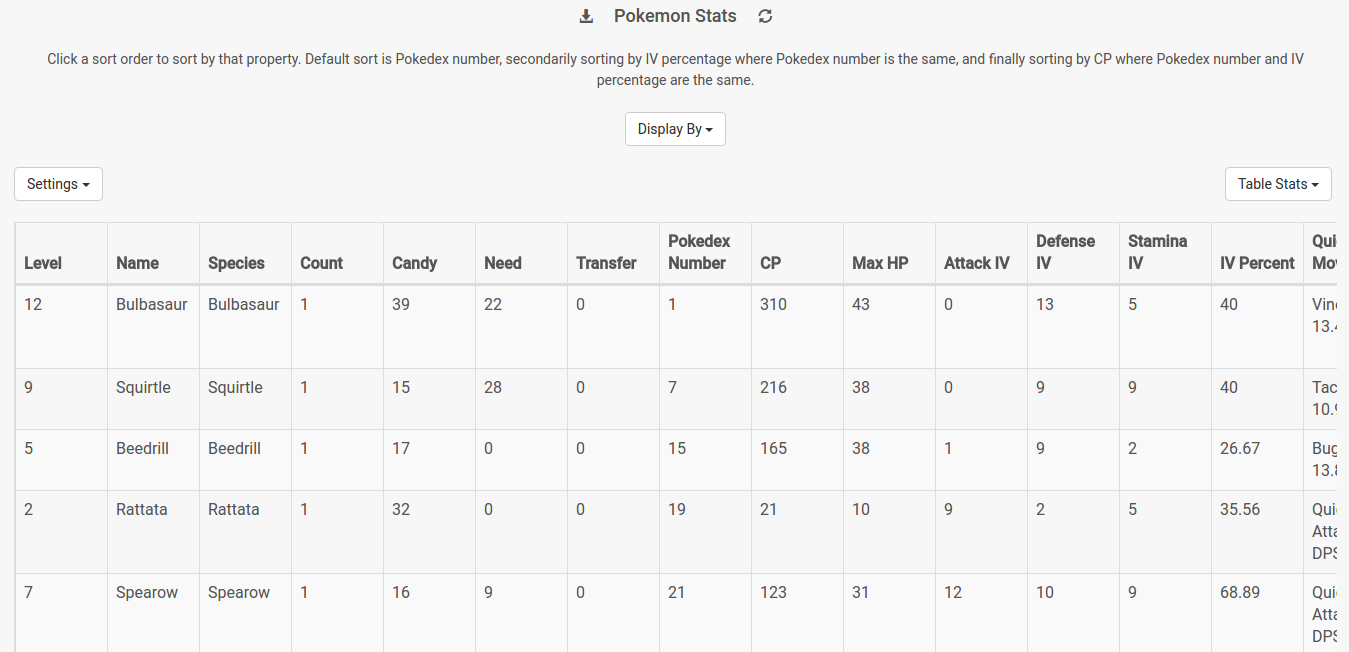 Requests information about Pokemon currently in inventory from Niantic and displays stats for each Pokemon in a card or table format.