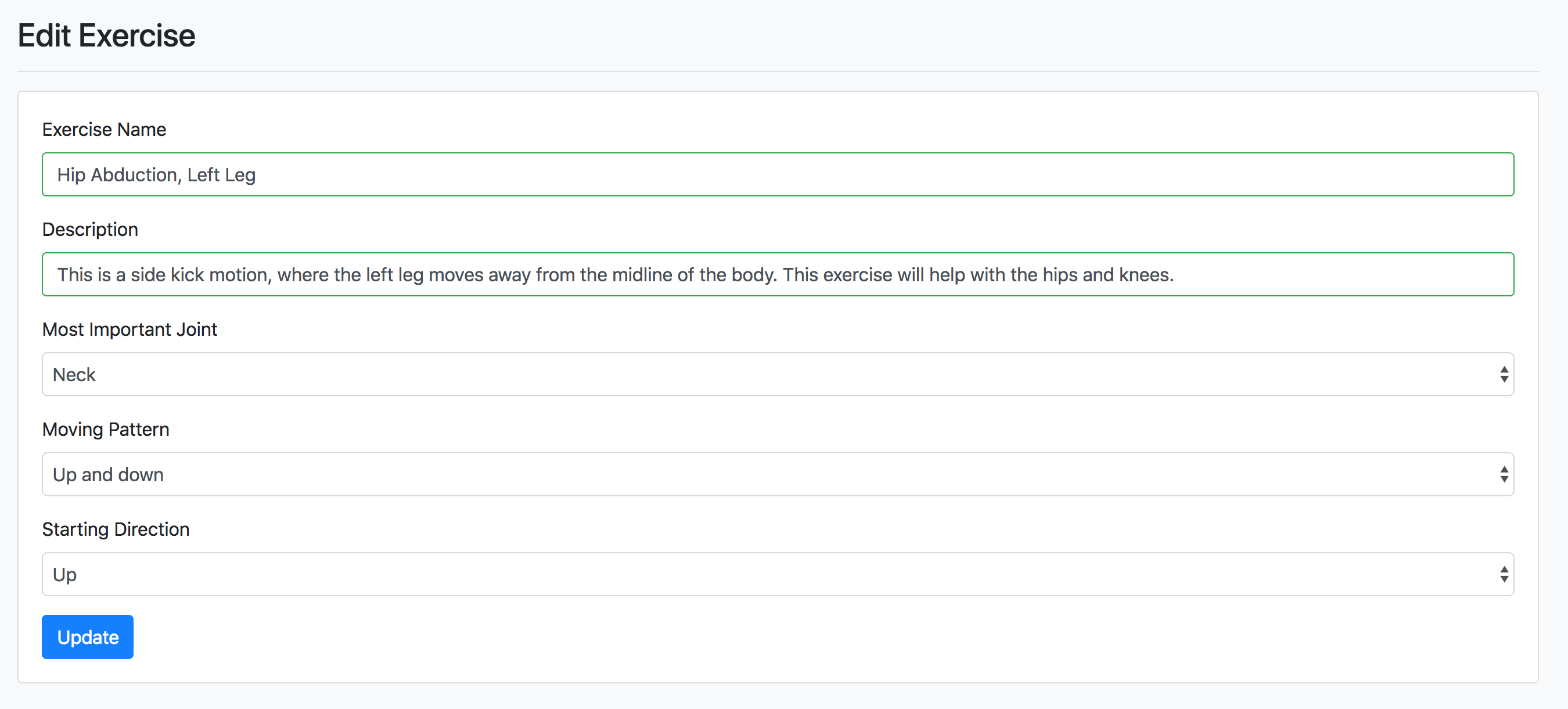 For example, when I created the exercise for Hip Abduction, Left Leg, I definitely selected "Left Ankle" as its most important joint. However, when I go to edit this exercise, I see that the Most Important Joint field is set to "Neck", which is the default. When I change this back to "Left Ankle" and click "Update", I do not get a successful confirmation message and am immediately directed back to the Exercises page.