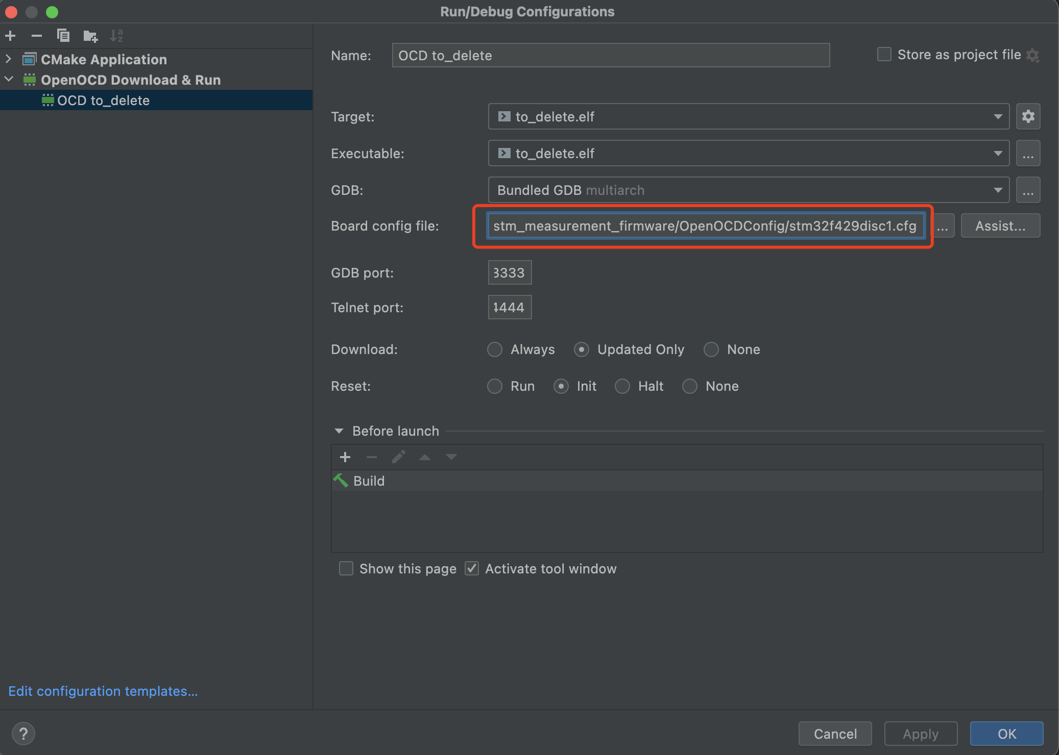 - Select Board Config File (stm32f429disc1.cfg in this project)