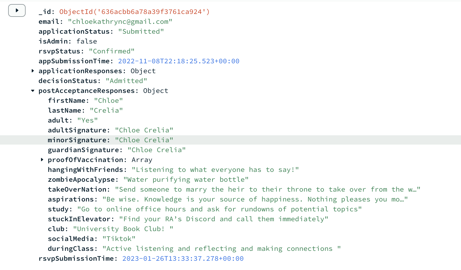 To view hacker data, access the application_data cluster on MongoDB and look at the postAcceptanceResponses field