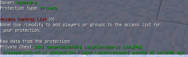 | Private | By default, only you can access the protection. You can also add other players and groups to the protection so that they, too can access it. So your chest and doors can only let in your close friends and those you choose to add to it. |