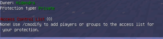 (Note: Towny users can grant access to town residents by prepending town: to the town name. example: /cprivate town:Smithtown )