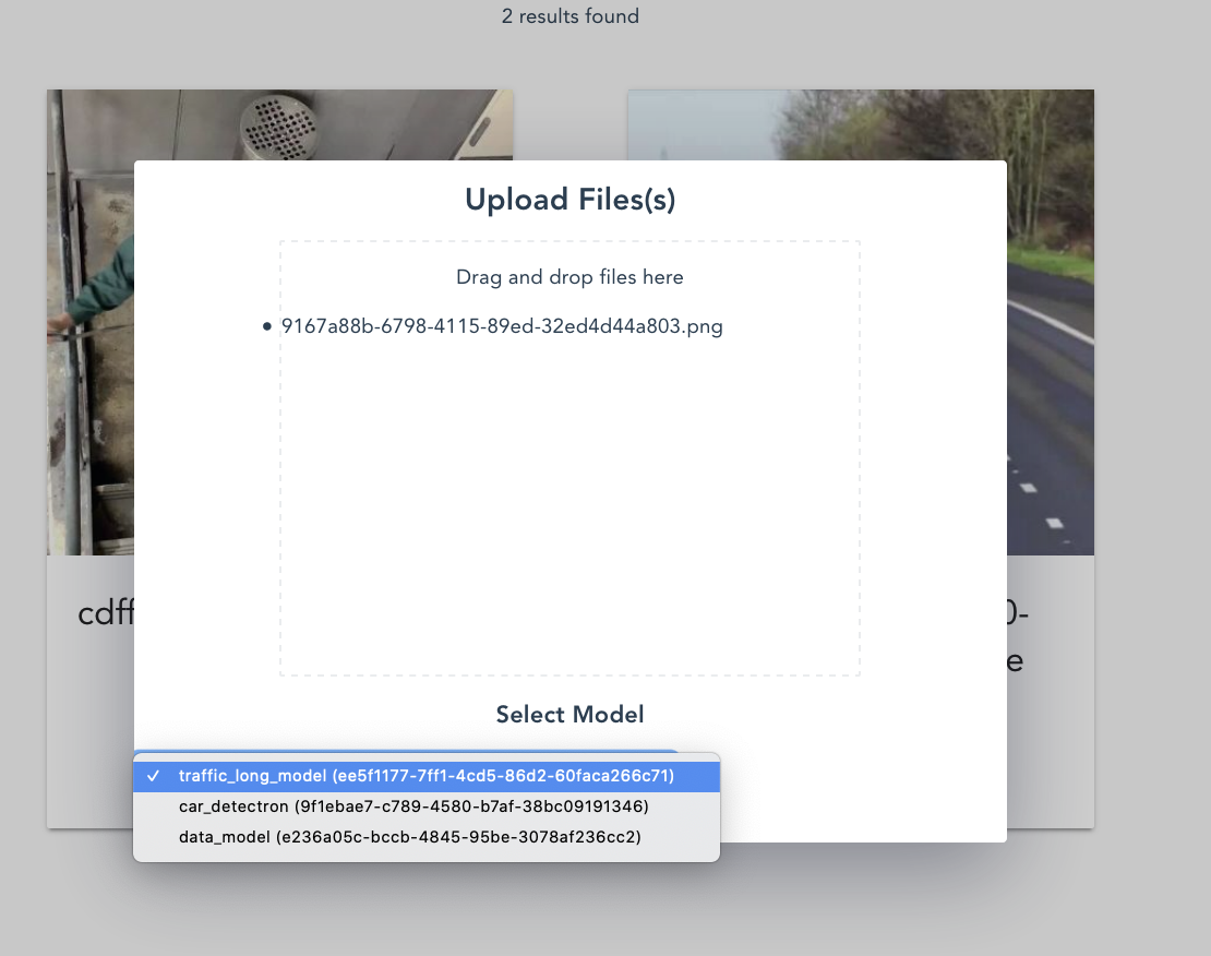 After providing our IBM Maximo Visual Inspection credentials, we can then use the dashboard to Let's upload a video or image to be processed by our custom model. We'll do this by clicking the "Upload Image(s)" button in the upper menu. Then, drag and drop images that need to be analyzed. Select a model from the selection dropbox, and then click the "Upload" button.