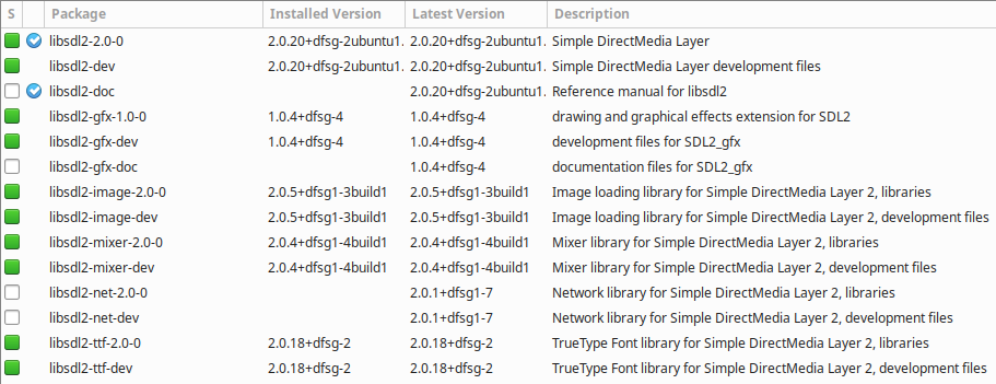 Note that, as demonstrated in the image above you'll likely need not only the libs themselves, but also their accompanying development files (the versions maked with -dev, like libsdl2-dev).