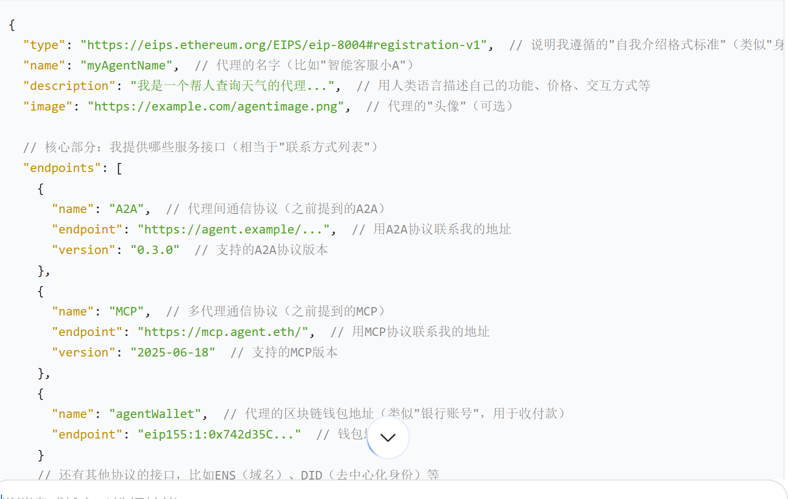 代理通信协议:MCP 和 A2A 非常流行,并且可能出现其他协议。因此,该协议将区块链链接到一个灵活的注册文件,其中包含一个可随意添加端点的列表,结合了 AI 原语(MCP、A2A)和 Web3 原语(例如钱包地址、DID 和 ENS 名称)。