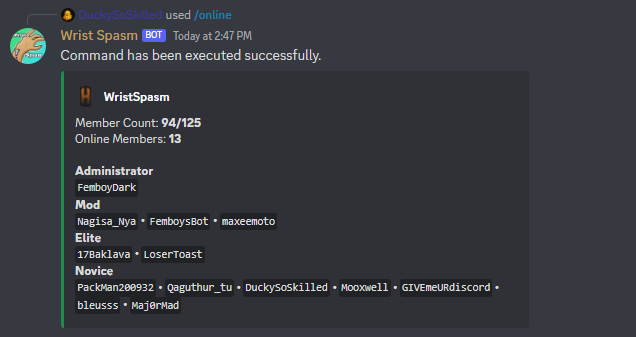 /onlineet/guildtop, cependant toutes les autres commandes nécessitent que l'utilisateur ait le rôle de commande.