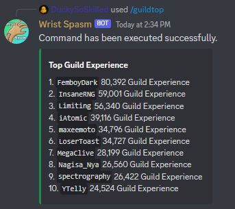 | guildexp | Expérience de guildes de l'utilisateur spécifié. | !guildexp [player] |