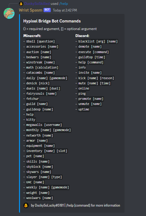 | skyblock | Statistiques Skyblock de l'utilisateur spécifié. | !skyblock [joueur] |