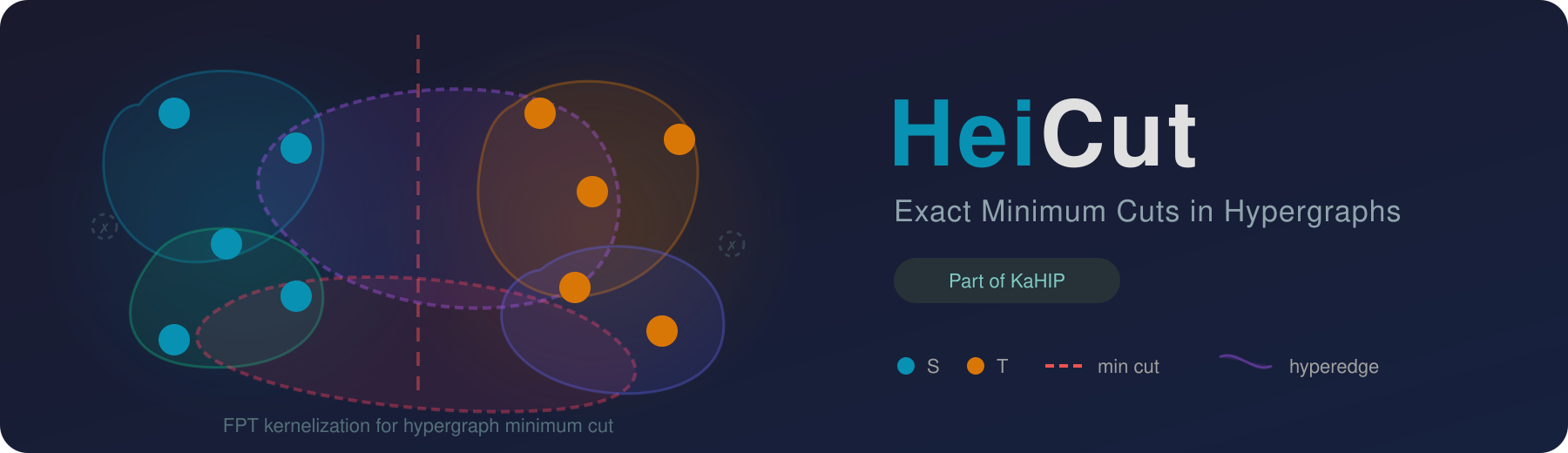 HeiCut is a highly efficient, exact solver for the minimum cut problem in hypergraphs using FPT kernelization. Given a hypergraph, the minimum cut problem asks for a partition of the vertices into two non-empty sets such that the total weight of hyperedges crossing the partition is minimized. HeiCut performs repeated rounds of provably exact reduction rules that preserve the minimum cut while drastically shrinking instance size, then applies an exact solver to the reduced hypergraph. Part of the KaHIP organization.