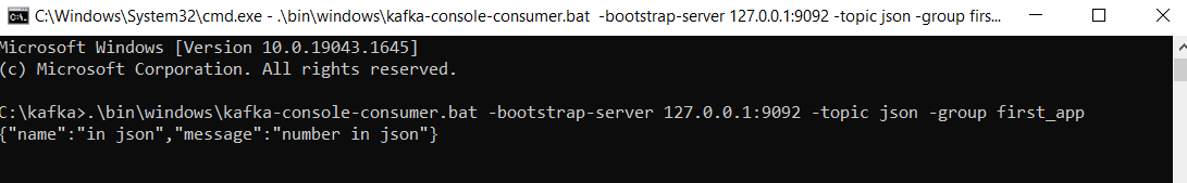 - .\bin\windows\kafka-console-consumer.bat -bootstrap-server 127.0.0.1:9092 -topic 'topic name'(without quote) -group first_app Now, send the message on the topic, you will find the output as shown below: