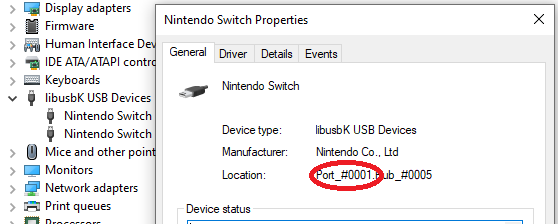 - On your computer open Device Manager, scroll down until you see "libusbK Devices", right click your device, select "Properties", make note of your USB port (without the leading zeroes).