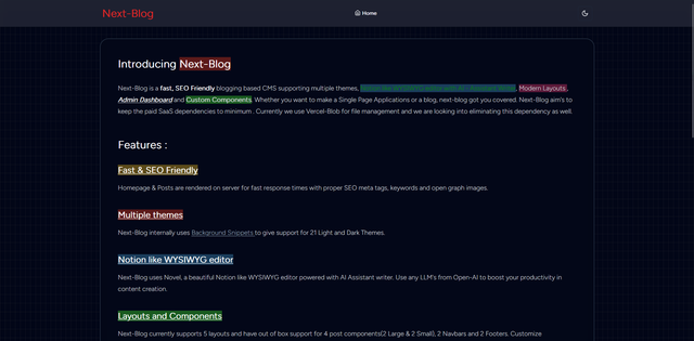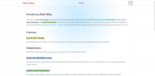 Next-Blog is a out-of-box fast, SEO Friendly blogging based CMS supporting multiple themes, Notion like WYSIWYG editor with AI Assistant Writer, Admin Dashboard and Customizable Layouts & Components. Whether you want to make a fast Single Page Applications or blogs, next-blog got you covered. Next-Blog is beginner friendly to use and aim's to keep the paid SaaS dependencies to minimum. Currently the only SaaS dependecy we use is Vercel-Blob for file management and we are looking into eliminating this dependency as well.