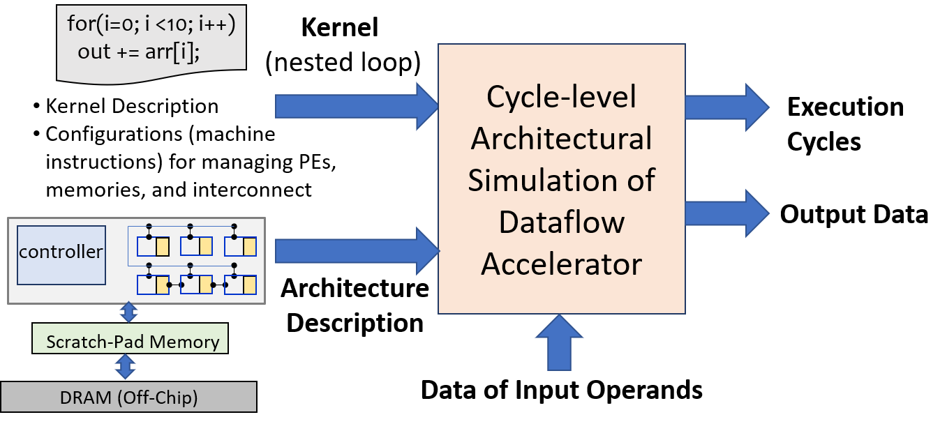 makeAbove figure provides a high-level overview of the simulator. Programmer or the compiler can specify the input kernel and accelerator architecture description, i.e., pipelining of the PEs, configuration of the memories, and interconnect topology. For the target kernel (nested loops), programmer also specifies configurations that corresponds to details (machine instructions) like how to manage the PEs, and schedule data transfers for memories and interconnect, and so forth. These are the details for an execution method or the mapping of the loops onto target architecture. Then, the simulator can execute cycle-level functionalities of the microarchitectural blocks and then it outputs execution cycles, and the resultant data. If the expected output data is provided, then the simulator can compare it with the generated output and inform us whether the simulation has terminated with a successful functionality.