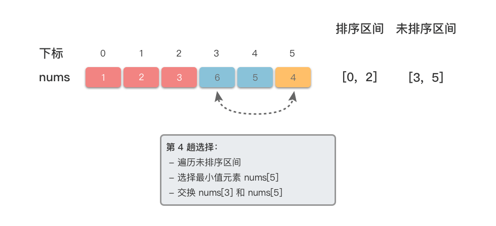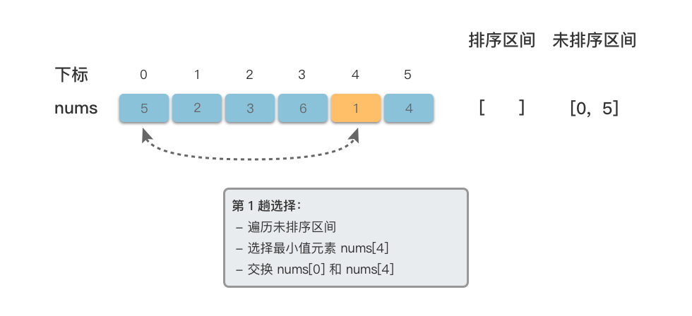 $min\underline{}i$ 与下标为$0$ 处的元素交换位置。如果下标为$0$ 处元素就是值最小的元素位置,则不用交换。 - 此时,$[0, 0]$ 为已排序区间,$[1, n - 1]$(总共