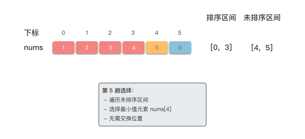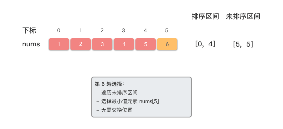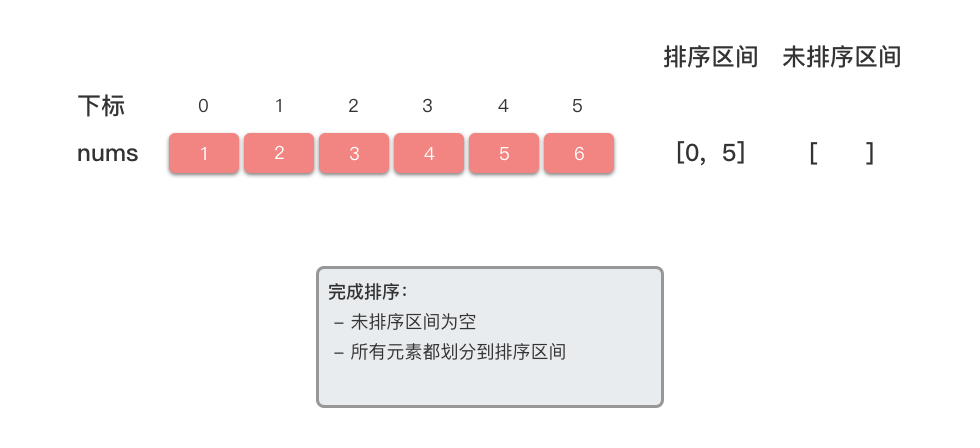 - 初始状态下,无已排序区间,未排序区间为