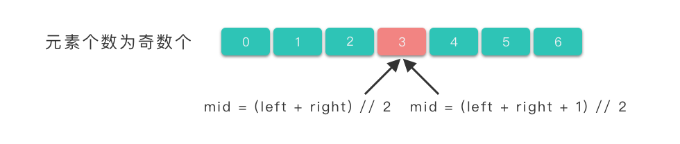 而当待查找区间中的元素个数为偶数时,使用 mid = (left + right) // 2 式子我们能取到中间靠左边元素的下标位置,使用 mid = (left + right + 1) // 2 式子我们能取到中间靠右边元素的下标位置。