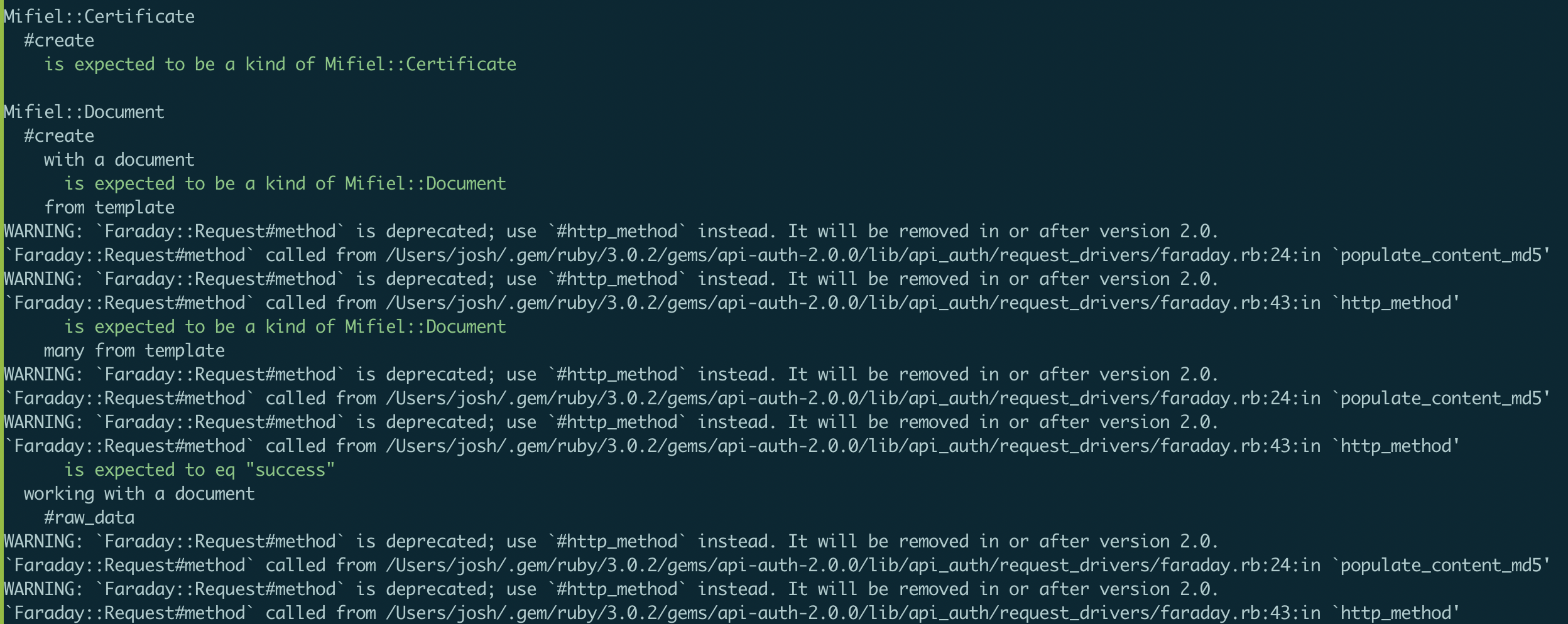 Example of the Faraday deprecation warning from Mifiel's test suite: