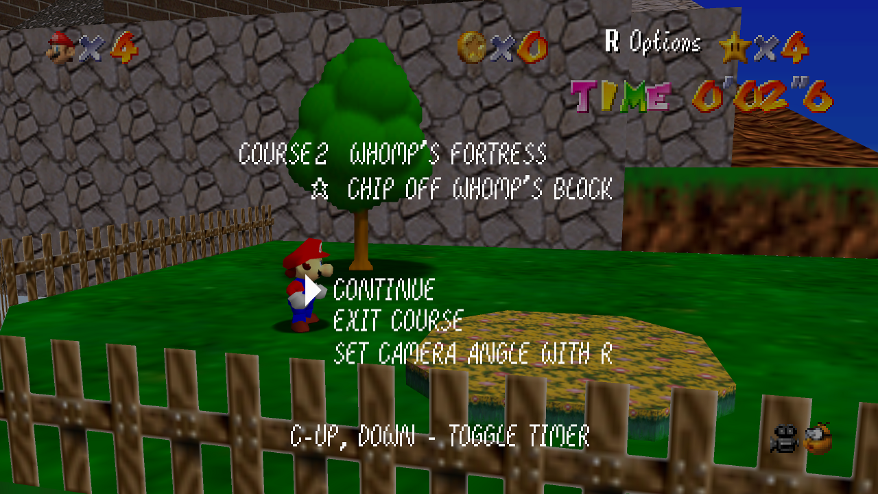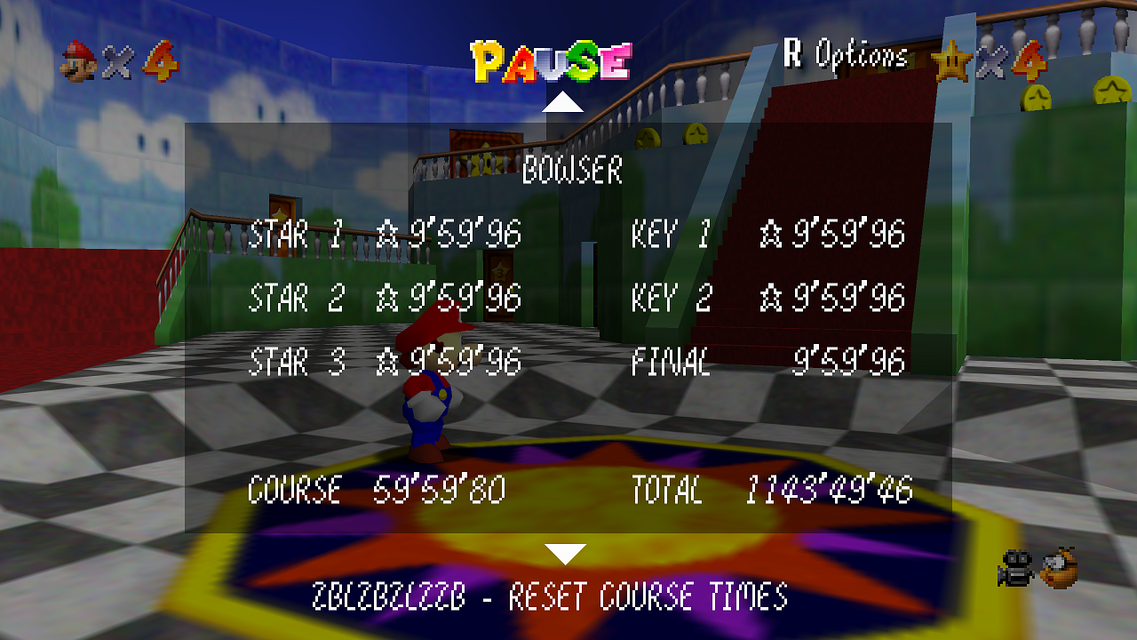 This is a mod that replaces the normal pause screen when you're outside a level with a new screen that shows your best times for each star, along with combined times for the current course and the entire game. There's a level timer (that can be toggled on/off) and a separate screen for Bowser stars/keys and castle secret stars (instead of grouping them together like the original game), and you can delete times for a single course with a button combination.