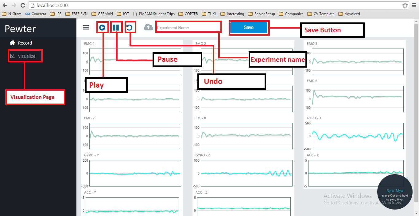 of raw data from Myo and conduct experiments on it. If you are working on raw data from the Myo Armband, then you can make use of Pewter's simple GUI to acquire data and work on it. It not only reduces devlopement time but also makes the life of a machine learning engineer easier. You can create experiments and visualise the data for doing some analysis before preprocessing and feature extraction. All the experiment data will be saved in Json format which makes it even convenient for reuse. The entire project is created using Node.js and I thank Thalmiclabs for the myo.js library which made my life a lot more simpler.