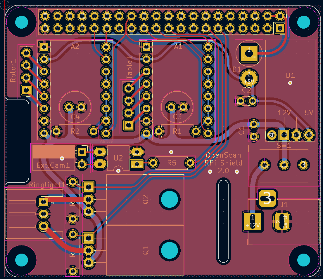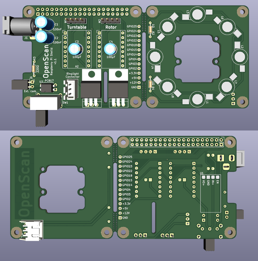 Currently, I re-design the PCBs in KiCAD to include more safety features and to stick closer to the usual design principles of PCB design to make future changes and additions easier to integrate. A 'Disable Motor' pin is included but also requires some coding to be activated in the OpenScan software. I personally like the HAT design, however, the official HAT design guide about EEPROM might collide with the current philosophy of OpenScan. You see, the current PCBs can easily be soldered by hand and are intentionally kept as low-level component PCBs. Flashing EEPROM is something that is usually not part of the repertoire of the common tinkerer and requires additional tools. Without the EEPROM following the HAT guide, we wouldn't be allowed to call it "HAT". That leaves practically two paths. Either designing and manufacturing the complete HAT including EEPROM so you can buy it off the shelf (slightly opposing the open idea of the project), or not including EEPROM at all, thereby creating a HAT-like/HAT-compatible/HAT-esque PCB without calling it "HAT". |