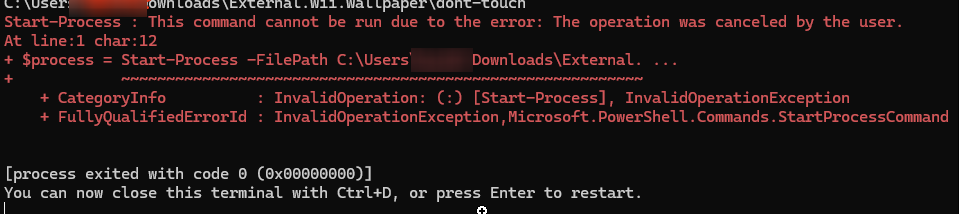 "The operation was canceled by the user. OR when running start, a powershell window flashes with an error and then closes, with your wallpaper not functioning"