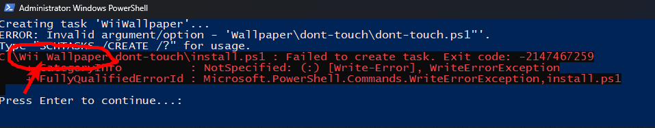In this example the folder "Wii Wallpaper" has a space in the middle, remove it and rerun install!