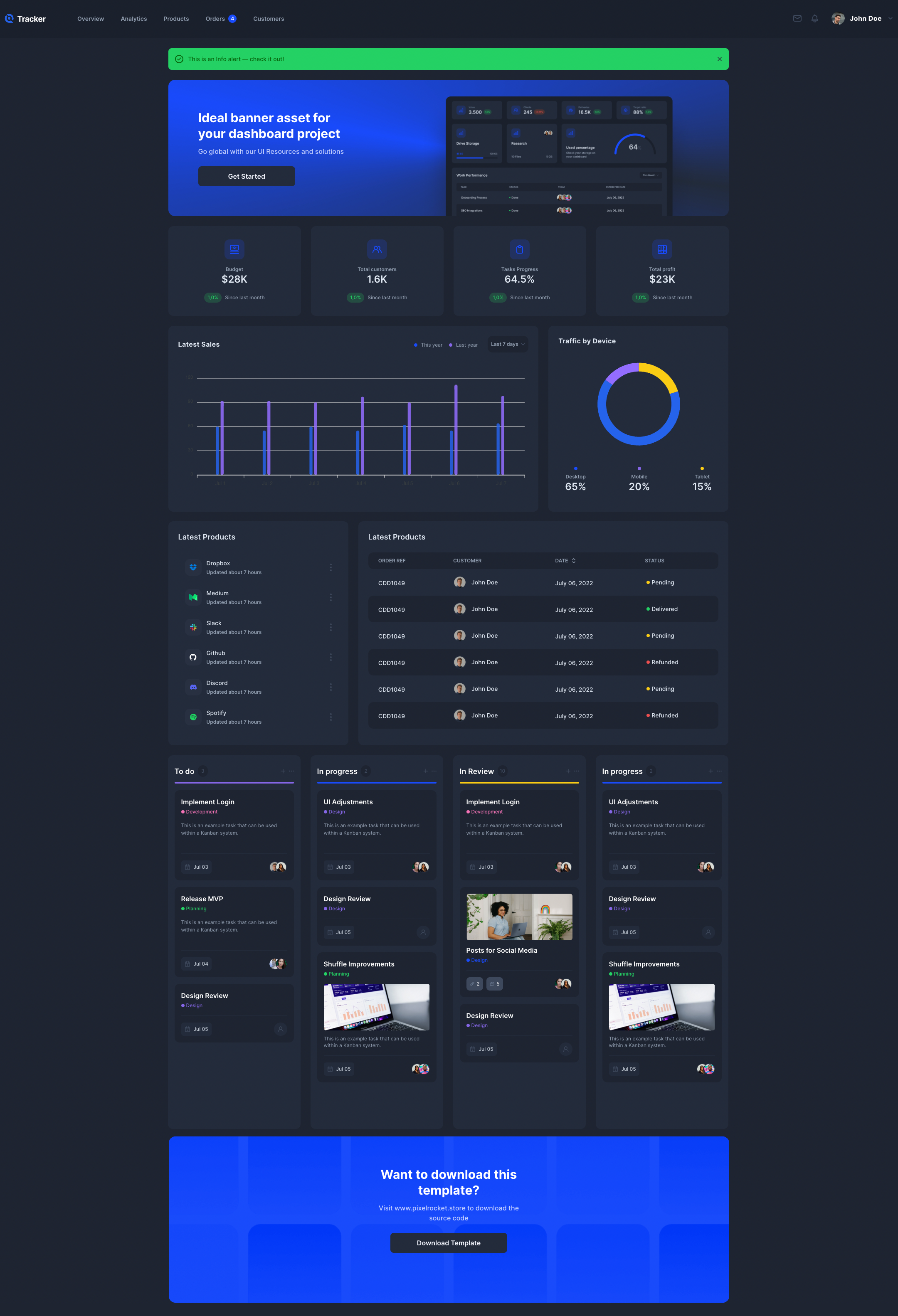 Introducing Tracker, a free one-page dashboard Tailwind CSS HTML template designed specifically for project management. The clean and professional design of Tracker is fully customizable with Tailwind CSS, allowing you to easily adapt the template to your project's needs. Tracker comes with custom components such as a Kanban board for visualizing workflow, a data management table, and call-to-action banners to help you draw attention to important information. These components are designed to help you manage your projects more efficiently and effectively, all while maintaining a sleek and streamlined user experience.