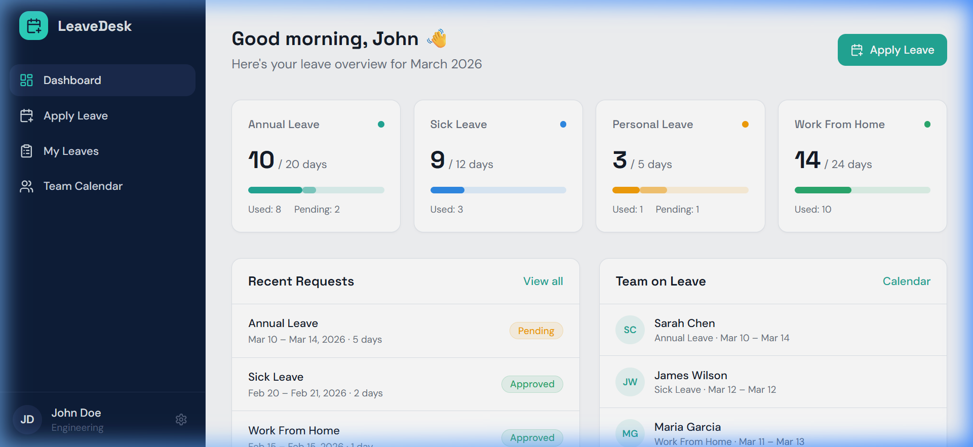 - 📅 Team Coordination: Real-time calendar view to visualize who's on leave across the engineering and product teams.