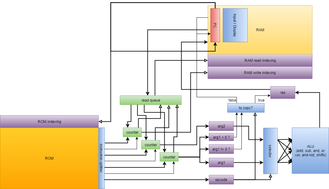 From here we developed an architecture for our processor. We spent significant effort on designing an architecture that was both as non-esoteric and as easily-implementable as possible. Whereas the Wireworld computer used a rudimentary transport-triggered architecture, this project uses a much more flexible RISC architecture complete with multiple opcodes and addressing modes. We created an assembly language, known as QFTASM (Quest for Tetris Assembly), which guided the construction of our processor.