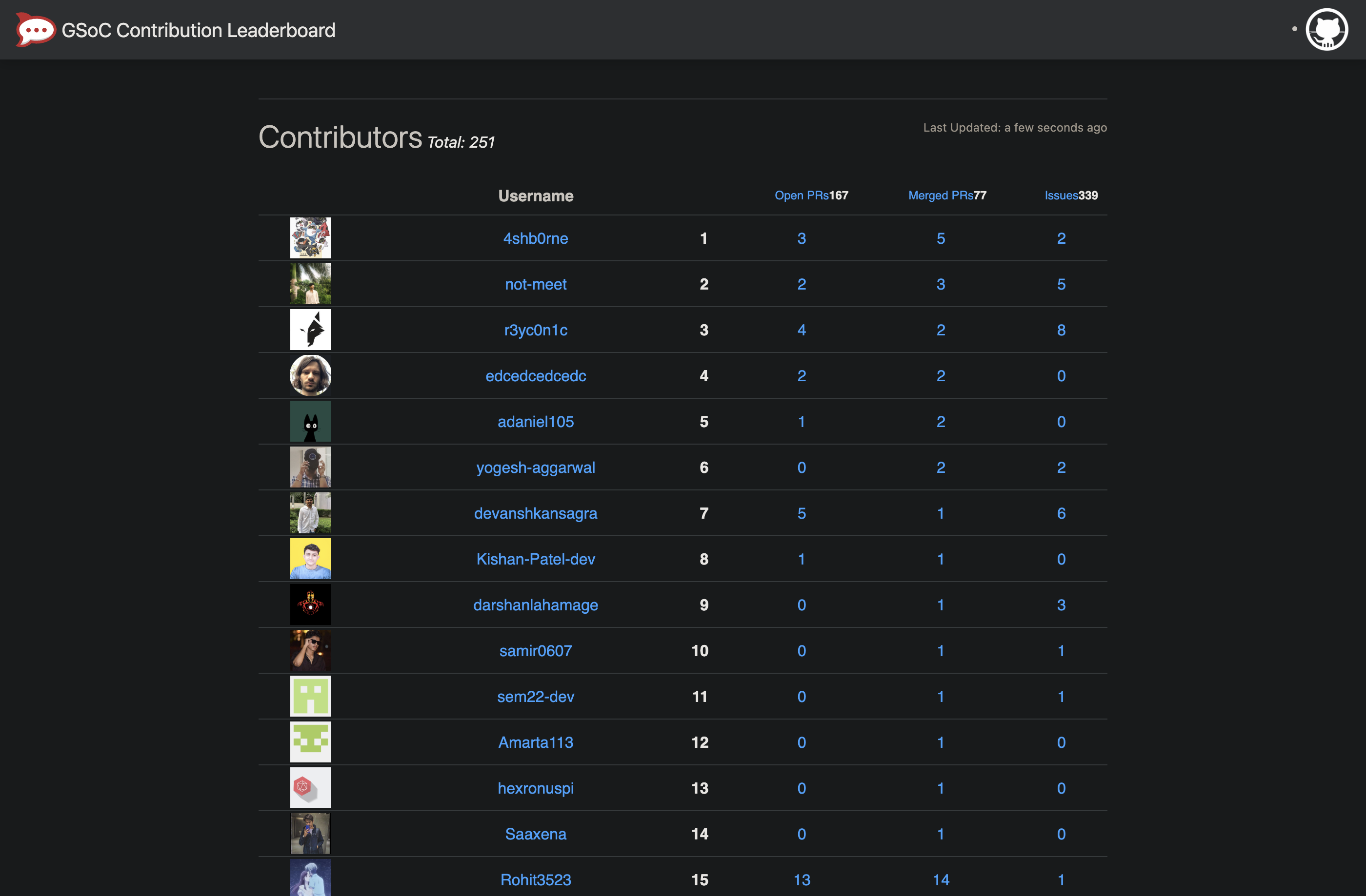 conflicts resolved, rebased on latest master. tested again with the gsoc 2025 data file (251 contributors):