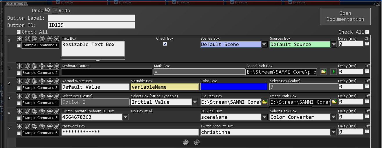 boxName: A string that serves as a friendly name for the box, displayed to the user in SAMMI Core.boxType: An integer that indicates the type of box. This integer corresponds to different types of boxes (e.g., resizable text box, check box, OBS Scenes box, etc.). See the table below for a list of all box types.defaultValue: The default value for the variable associated with this box.- (optional)