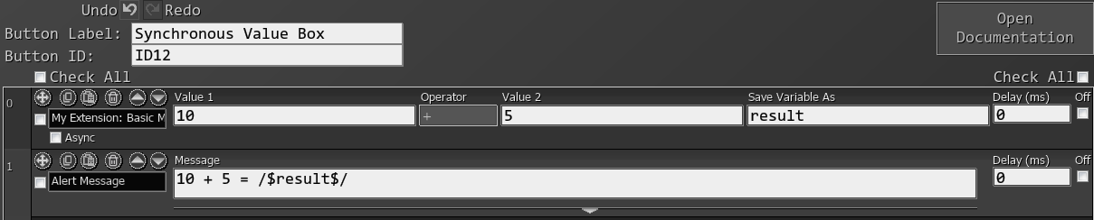 }, true, true);This extension command has a save variable parameter. This means SAMMI automatically waits for a value. It also includes an options object with the timeoutAfter key set to set a timeout of 10000 milliseconds rather than the default 30000 milliseconds.