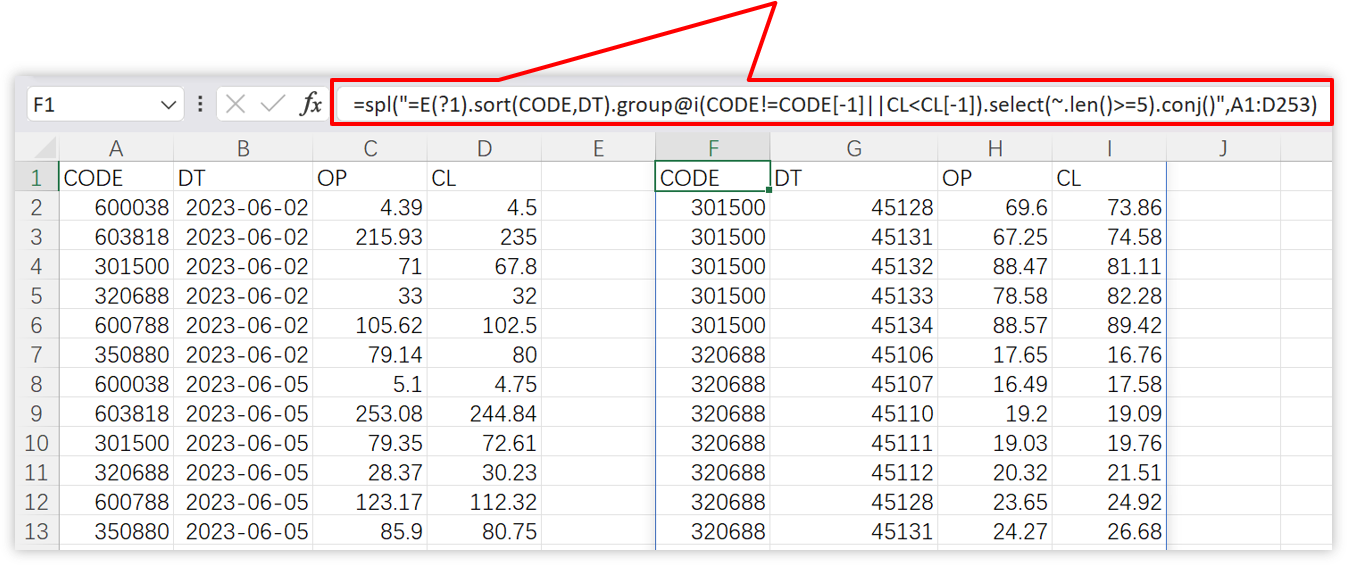 =spl("=E(?1).sort(CODE,DT).group@i(CODE!=CODE[-1]||CL<CL[-1]).select(~.len()>=5).conj()",A1:D253)